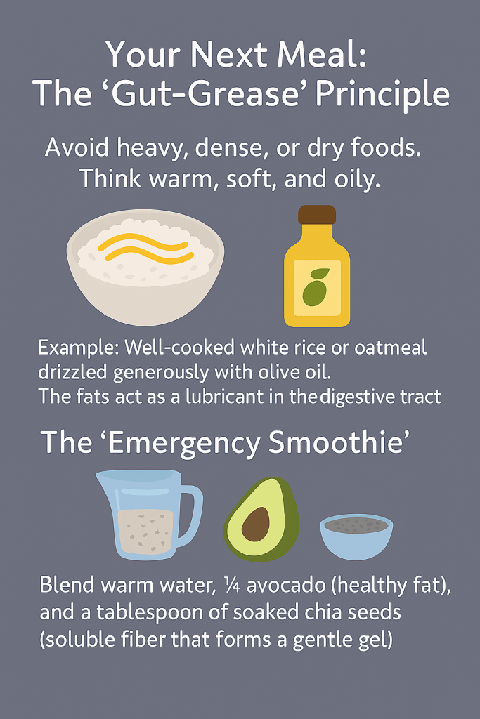 - The “Emergency Smoothie”: Blend warm water, ¼ avocado (healthy fat), and a tablespoon of soaked chia seeds (soluble fiber that forms a gentle gel).